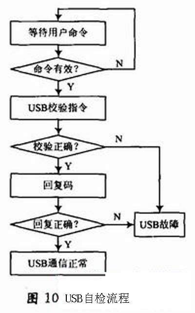 為了保證設備本身的工作正常,電纜測試係統提供自檢功能。自檢流程分為兩部分,第一部分對USB通道進行自檢,USB自檢流程如圖10所(suo)示(shi)。係(xi)統(tong)上(shang)電(dian)後(hou),工(gong)控(kong)機(ji)發(fa)送(song)校(xiao)驗(yan)指(zhi)令(ling),單(dan)片(pian)機(ji)判(pan)斷(duan)校(xiao)驗(yan)碼(ma)是(shi)否(fou)正(zheng)確(que),在(zai)校(xiao)驗(yan)碼(ma)正(zheng)確(que)的(de)情(qing)況(kuang)下(xia),按(an)照(zhao)協(xie)議(yi)返(fan)回(hui)複(fu)碼(ma),工(gong)控(kong)機(ji)判(pan)斷(duan)回(hui)複(fu)碼(ma)正(zheng)確(que)的(de)情(qing)況(kuang)下(xia),USB通信建立正常。第二部分是對繼電器陣列進行自檢,其流程與導通測試類似。以測試點1和測試點2為例,首先,閉合測試點1的輸入繼電器,采樣測試電壓,如果係統判斷為斷開,則可以說明測試點1的輸出繼電器沒有常閉,反之則說明為常閉故障。把測試點1的輸入繼電器更換為輸出繼電器,采用同樣的方法可以判斷出測試點1的輸入繼電器是否為常閉故障。其次,分別打開測試點1的輸入和輸出繼電器,如果係統判斷為導通,在第一步的基礎上就可以說明兩個繼電器均正常;如果係統判斷為斷開,則兩個繼電器中至少有一個為常開故障。最後,在外部端口上接入自檢插頭,分別選擇測試點1的輸入繼電器和測試點2的輸出繼電器,如果係統判斷為導通,則可以說明內部繼電器和單板到端口的引線正常,反之則說明繼電器到測試端的引線出現問題。