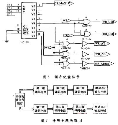 當11位地址準備完畢後,由單片機發送地址有效信號,將地址信號送給譯碼電路。譯碼電路原理如圖7所示。