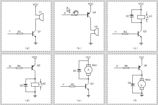 選用NPN 型、還是PNP 型晶體管驅動負載,要看設計者的要求。如圖1(a)、(c)、(e)是使用NPN 型晶體管驅動負載的電路,高電平“1”可以控製晶體管導通(負載通電)、低電平“0”使晶體管截止(負載斷電)。而圖1(b)、(d)、(f)是使用PNP 型晶體管驅動負載的電路,導通條件剛好相反。