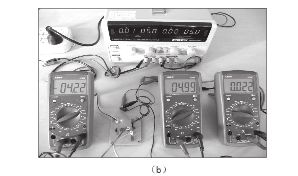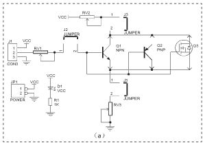 我們製作了晶體管的測試電路板,分別對NPN 型晶體管2N5551、PNP 型晶體管2N5401 驅動電路中相同負載的不同接法做了實物測試。圖4(a)是晶體管測試電路板的原理圖,將圖4(a)左邊J1 的1、2 引腳短接,可以測試NPN 型晶體管負載驅動電路;將J1的2、3引腳短接,可以測試PNP型晶體管負載驅動電路。