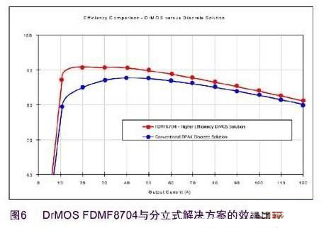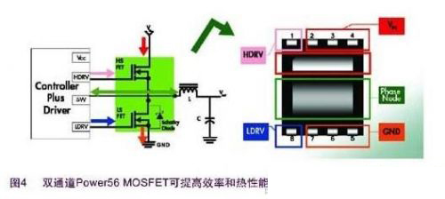 1.帶驅動器和MOSFET的分立式解決方案現在仍在普遍使用。為滿足所有設計要求,現在飛兆半導體提供的采用小尺寸熱性能增強型MLP(QFN)封裝的產品,可獲得高係統性能。MOSFET實現了首先采用MLP封裝(見圖3所示)。其Power56和Power33產品係列采用最新的PowerTrench技術,能夠同時提供超低RDSon和低Qg,從而適用於高開關頻率應用。鍵合技術可減小封裝的電感,提高封裝有限的ID,適用於大電流應用。其低端FET產品組合采用SyncFET集成了肖特基二極管,在實現高開關性能的同時降低了熱耗。