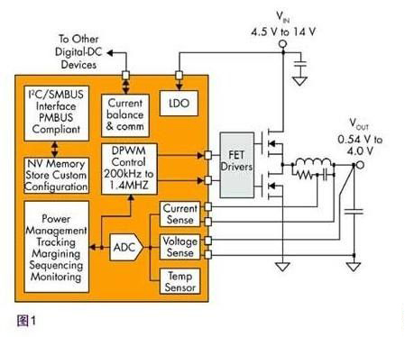 一個應用建議是把DC-DC轉換器盡可能靠近負載放置。這樣做可以把EMI降至最低、減小寬的大電流線跡所占用的板空間,並改進轉換器的動態特性。“分布式”功率管理係統應運而生,在這種係統中,所有轉換器都理想地彼此相連。能夠與其它轉換器在網絡中協同工作的一個控製器例子是FD2004,如圖1的模塊示意圖所示。