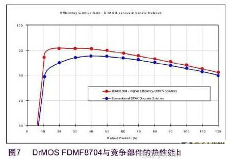 帶有Power56 MOSFET和SO-8驅動器的分立式解決方案的板卡占位麵積在120mm2左右,而MCM隻需要64mm2或36mm2.後者模塊中的各個器件經精心挑選並全麵優化,相比分立式解決方案其性能更高,熱性能也更好(圖6和圖7)。受電腦行業的推動,這種解決方案可使電流高達30A,並針對最高1MHz的開關頻率優化。甚至在大電流設計中即使考慮到熱設計規則,也無需散熱器,因係統中空氣流對於該芯片散熱是足夠的。