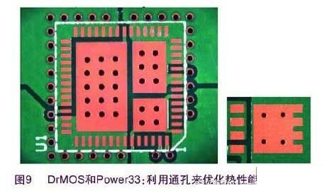 至於版圖布局,金屬較多顯然很有助益。更厚的頂層有助於降低溫度,不過也許對PCB的其餘部分並不適合,因為成本增加了,其它元件需要的更精細的間距也不可能實現。更大的銅麵積很有用,但又會消耗PCB空間。這些應該盡可能由焊料覆蓋,因為金屬表麵比塗漆表麵的散熱性更好。在多層PCB中,有時利用內層來協助散熱。熱通孔(填充焊料)有時可用來把熱量擴散到PCB的另一麵去(圖9)。