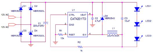 該設計中提供了使用CAT4201設計驅動3顆LED的MR-16燈所需的各種要素。CAT4201有助於實現MR-16兼容適配器更小的尺寸和更少的元件。