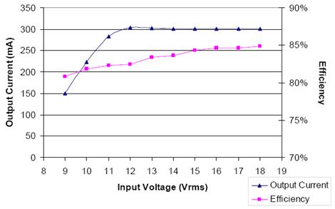 在電路配置方麵,VBAT的額定電壓為-0.3至+40 V,因此整流橋上的輸入電壓高達24 Vac也是安全的。要保持較高輸入電壓水平就需要一個大容量的C1。大幅波動的經整流的AC電流將在雙倍AC線路頻率條件下把輸出電流拉至零,因此減少了輸出電流。220 μF的電容對這個設計已經足夠了。對於12 Vac輸入,C1額定電壓應該是25 V。由於需要較低的正向電壓,整流橋選用了MBR0520L表麵貼裝肖特基二極管。