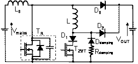 從理論上講,因為所有的開關損耗都被消除,零壓轉換(ZVT)是功率因數校正(PFC)應用最理想的拓撲。此外,不管輸入和輸出功率如何變化,這種電路都能正常工作。然而,在實際應用中,升壓二極管DB的反向恢複電流對零壓轉換電路的影響非常明顯,致使電感和最小占空比都受到一定程度的限製。因為小線圈L上的重置電流,D2 的反向恢複電流包含高應力電壓和寄生阻尼振蕩。最後,PN二極管的動態特性影響零壓轉換(ZVT)電路的總體能效,因為這個晶體管的導通時間應該增加,而且為降低半導體器件遭受的電應力,必須增加一個有損緩衝器。