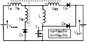 這個創新的電路是按照軟開關標準設計的,如圖4所示,為恢複小線圈L貯存的電能,在升壓線圈LB 附近新增兩個二極管 D1和D2 和兩個輔助線圈NS1和NS2 。