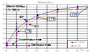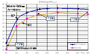 在90 VRMS電壓時,軟開關法的優點加上COSS 放電節省的電能好處進一步加強了BC²電路的優點。在450W輸出功率時,BC²比碳化矽二極管省電5.4 W,在低負載下,因為無關斷損耗,BC²比碳化矽二極管省電1.7%。