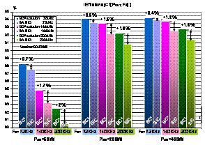 在圖11的示例中,一個導通電阻RDS(on)小於0.46Ω的、輸出功率450 W的功率MOSFET與一個碳化矽二極管和兩個並聯功率MOSFET的結構的能效相同。