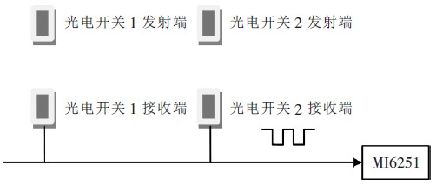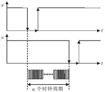 當(dang)無(wu)運(yun)動(dong)物(wu)體(ti)遮(zhe)擋(dang)光(guang)電(dian)開(kai)關(guan)時(shi),光(guang)電(dian)開(kai)關(guan)的(de)接(jie)收(shou)端(duan)輸(shu)出(chu)高(gao)電(dian)平(ping)信(xin)號(hao),當(dang)有(you)物(wu)體(ti)經(jing)過(guo)遮(zhe)擋(dang)時(shi),光(guang)電(dian)開(kai)關(guan)的(de)接(jie)收(shou)端(duan)輸(shu)出(chu)低(di)電(dian)平(ping)信(xin)號(hao)。即(ji)當(dang)高(gao)速(su)物(wu)體(ti)經(jing)過(guo)一(yi)對(dui)光(guang)電(dian)開(kai)關(guan)時(shi)會(hui)先(xian)後(hou)形(xing)成(cheng)2 個高電平到低電平的脈衝信號。通過計時周期的方式測出這2 個下降沿之間的計數周期個數n,計時原理如圖1 所示。
