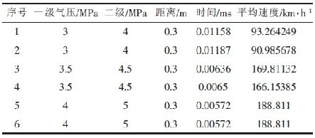 本測速係統已成功應用在雙級空氣炮彈射物體測速實驗中,實驗數據如表1 所示。