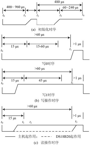 (1)初始化時序。時序見圖2(a),主機總線t0時刻發送一複位脈衝(最短為480s的低電平信號)接著在t1時刻釋放總線並進入接收狀態,DS18B20在檢測到總線的上升沿之後等待15~60μs,接著DS18B20在t2時刻發出存在脈衝(低電平持續60~240s),如圖中虛線所示。