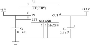 由於nRF2401的供電電壓範圍為1.9~3.6V,而AT89S51單片機的供電電壓是5V,為了使芯片正常工作,需要進行電平轉換和分壓處理,設計采用MAXIM公司的MAX884芯片進行5V到3.3V 電平轉換,如圖5所示。
