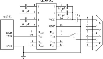 串口是計算機上一種非常通用設備通信的協議,大多數計算機包含2個基於RS232的串口,PC的串行口是RS232C電平,而單片機的串行口是TTL電平,兩者之間通過串口通信時,必須進行電平轉換,設計運用MAX232A芯片完成單片機與PC之間的數據傳輸,硬件連接電路如圖6所示。