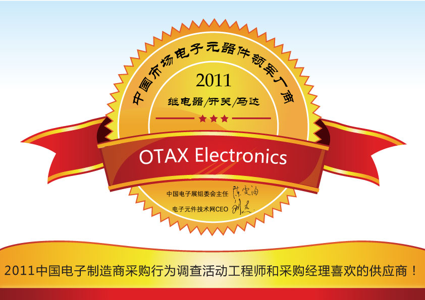 在近日剛剛結束的2011中國電子製造商采購行為調查暨中國市場電子元器件領軍廠商的評選活動中,OTAX Electronics憑借持續穩定的產品、技術和服務等多方麵優勢,以及在工程師心目中形成的良好形象,一舉榮獲2011中國市場電子元器件(繼電器/開關/馬達類)領軍廠商稱號!