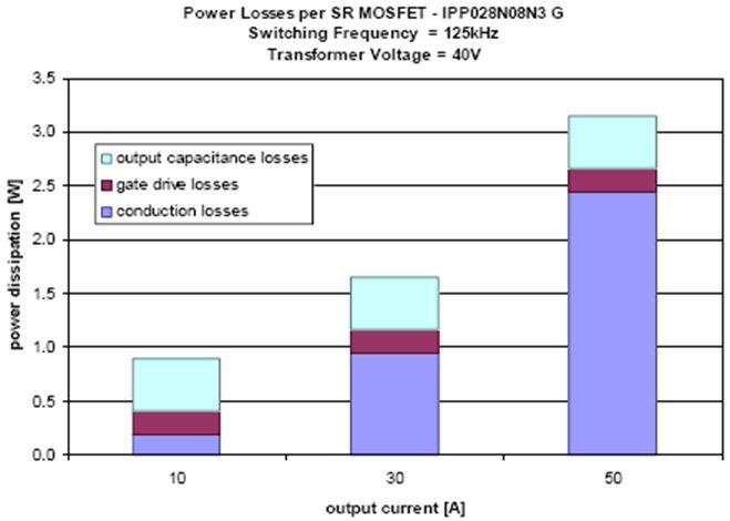 要選擇最優的MOSFET來實現同步整流,必須充分理解MOSFET的功耗產生機製。首先,必須區分開隨負載而變化的導通損耗與基本保持不變的開關損耗。導通損耗取決於MOSFET的RDS(on)和內部體二極管的正向電壓VSD。隨著輸出電流的提高,導通損耗(RDS(on)損耗)也會相應地增加。為確保兩個SR MOSFET之間互鎖,以避免出現直通電流,必須實現一定的死區時間。因此,在開啟一次側之前,必須關斷相應的MOSFET。由於該MOSFET正在導通全部續流電流,因此,這些電流將不得不從MOSFET溝道轉而流向內部的體二極管,並由此產生額外的體二極管損耗。體二極管的導通時間很短,僅為50 ns至100 ns左右,因而,當輸出電壓比體二極管的正向電壓高得多時,這些損耗可以忽略不計。