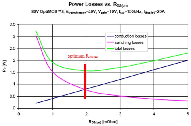 在選擇最適當的MOSFET時,必須特別注意RDS(on) 的取值範圍,如圖3所示。當RDS(on)超出最優值時,總功耗將隨RDS(on)的提高而線性增加。但當RDS(on) 降至低於最優值時,總功耗也會因輸出電容的快速增加而急劇上升。此外,在圖3中可以看出,可實現最低功耗的RDS(on)值範圍相當寬。在本例中,當RDS(on)在1毫歐姆至3毫歐姆範圍內時,總功耗始終大致相同。但是,在此範圍之外,RDS(on)僅下降0.5毫歐姆,便會令總功耗提高一倍,從而嚴重降低電源轉換器的效率。