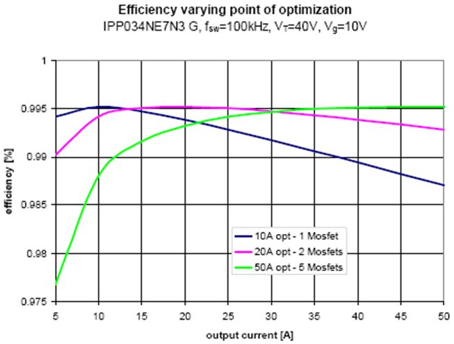 為闡明這個問題,圖4顯示了不同優化方法得到的效率。圖中所示效率曲線為,當變壓器電壓為40V、柵極驅動電壓為10V、開關頻率為100kHz時計算得到的12V同步整流級的效率。在75V優化表中選擇 IPP034NE7N3,按10 A MOSFET電流進行設計,所得到的優化方案僅需一個MOSFET。如圖4所示,這種優化方案能夠在低電流時實現很高的效率,而在高電流時效率卻極低。按50 A進行優化設計,所得到的最佳方案則需要5個MOSFET。caiyongzhezhongyouhuafangan,didianliushidexiaolvjiangdidebunengjieshou,danzaimanfuzaishikeyidadaozuigaoxiaolv。yinci,duigaishezhieryan,zuijiayouhuafanganshicaiyonglianggebingliandeMOSFET,從而獲得整體均衡的效率。