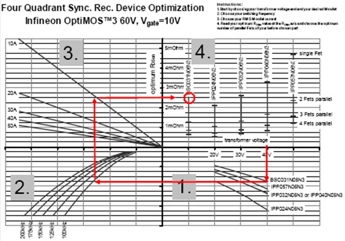 使用優化表時,首先從次級變壓器電壓開始。在所用電壓值位置,畫一條垂直的直線。在兩條線相交處可以選出特定的MOSFET。通過一條水平的直線和一條垂直的直線,便可選擇開關頻率和MOSFET電流。如前麵所討論,按最好從滿負載的20%至30%的電流值開始進行選擇。此時,可以在正Y軸上讀取最優RDS(on)值。在第四個象限中,顯示了並聯MOSFET的最佳數量。在第四個象限中,必須選擇之前在第一個象限中選定的MOSFET型號。然後,按同樣的參數(變壓器電壓、開關頻率和電流RMS)對另一個型號的MOSFET重複執行這個選擇過程。比較兩次選擇所得到的最優RDS(on)值,最優RDS(on)值越低的MOSFET所產生的功耗也越低,因而是更加高效的解決方案。