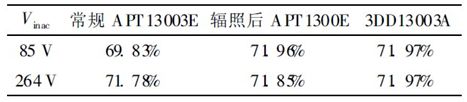 表3是AP3765序列充電器中采用經過10 kGy電子輻照的APT13003E 及3DD13003A 在85 V 和230 V 輸入電壓下輸出負載電流分別是0. 15 A、0.30 A、0. 45 A、0. 60 A 係統平均效率的結果。從表3中可以看出, 10 kGy電子輻照後的APT13003E的效率與3DD13003A 的效率基本相同。