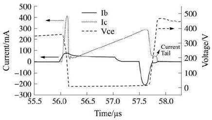 在開關晶體管關斷時, 集電極電流不能馬上降為0, 而集電極電壓已經從Vcesat開始上升, 在開關晶體管上產生電壓電流交替現象, 從而產生關斷損耗。
