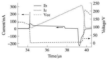 而在264 V輸入電壓下, 輻照後關斷損耗隻有較小幅度的減小, 因此總損耗基本不變, 係統效率也沒有改善。如圖4 和圖5 分別為未經輻照的APT13003E 在85 V 和264 V輸入電壓下基極電流、集電極電壓和電流的波形。比較圖4和圖5中可以看出, 在264 V 輸入電壓條件下導通時集電極電流的尖峰比起85 V 時要大很多, 這是因為導通時變壓器寄生電容充電電壓增大了2. 1倍, 但充電時間隻增加了約0. 6倍, 所以充電電流就會大大增加, 這也導致了APT13003E 的導通損耗由85 V 下的0. 016W 變為264 V下的0. 183W, 此時導通損耗占了總的損耗的大部分, 而電子輻照對導通損耗並沒有改善; 另一方麵, 在APT13003E 關斷時, 集電極電壓並沒有直接降到0, 而是先經過一個近100 ns的電流“ 尾巴”之後, 才又下降到0, 此時集電極電壓已經比較大了, 因此這個電流“尾巴”所造成的損耗占關斷損耗的比例較大。產生這個“尾巴”的原因是, 關斷開關晶體管時, 由於管子的基區比較薄, 過大的基極電流引起較大的基區電位差, 使VBE 為負的情況下發射結局部正向偏置, 集電極電流遲遲降不下來。