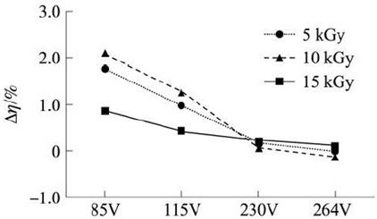 本文采用了10MeV 電子輻照來降低開關晶體管的下降延時, 以此來降低開關晶體管的關斷損耗, zaijiaodijiaoliushurudianyaxiashidekaiguandianyuanxiaolvdedaoletigao,danzaijiaogaojiaoliushurudianyaxiayouyubianyaqijishengdianrongchongdianzaochengdaotongsunhaoguodajiguanduanjieduanjidianjidianliu“尾巴”的存在, 使得係統效率沒有改善。由於電子輻照使得導通損耗和通態損耗增加, 因此隻有采用合適的電子輻照劑量才能使係統效率得到最大的提高。采用合適的電子輻照劑量的開關晶體管與采用橫向PNP鉗位型晶體管的開關電源係統效率基本相同。