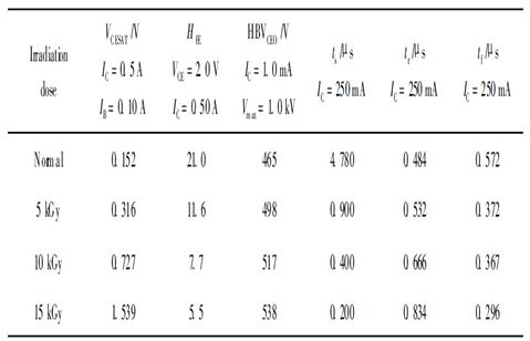 從表1中我們可以看到, 經過輻照後, 儲存時間ts 隨著輻照劑量的增大有很大幅度的減小, 下降時間tf 有所減小, 上升時間tr 有所增加; 電流放大係數隨著輻照劑量的增加而下降; 飽和壓降和擊穿電壓HBVceo隨輻照劑量的增大而增大。
