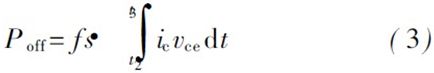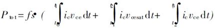 開關晶體管在工作過程中的損耗分為開關損耗和穩態損耗, 其中開關損耗包括導通損耗和關斷損耗, 穩態損耗包括通態損耗和截止損耗, 其中截止損耗占總的損耗的比率很小, 可以忽略不計。我們把Vce由90% Vindc降到110% Vcesat所用的時間定義為導通延時, 即圖2中的t1 - t0, 把IC 由90% Icmax下降到0所用的時間定義為關斷延時, 即t3 - t2。