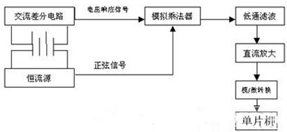 為(wei)了(le)解(jie)決(jue)上(shang)述(shu)各(ge)方(fang)法(fa)的(de)缺(que)陷(xian),本(ben)文(wen)采(cai)用(yong)了(le)四(si)端(duan)子(zi)測(ce)量(liang)方(fang)式(shi),將(jiang)蓄(xu)電(dian)池(chi)兩(liang)端(duan)上(shang)的(de)電(dian)壓(ya)響(xiang)應(ying)信(xin)號(hao)通(tong)過(guo)交(jiao)流(liu)差(cha)分(fen)電(dian)路(lu)與(yu)產(chan)生(sheng)恒(heng)定(ding)交(jiao)流(liu)源(yuan)的(de)正(zheng)弦(xian)信(xin)號(hao)經(jing)過(guo)模(mo)擬(ni)乘(cheng)法(fa)器(qi)相(xiang)乘(cheng),再(zai)將(jiang)模(mo)擬(ni)乘(cheng)法(fa)器(qi)的(de)輸(shu)出(chu)電(dian)壓(ya)信(xin)號(hao)通(tong)過(guo)濾(lv)波(bo)電(dian)路(lu),使(shi)交(jiao)流(liu)信(xin)號(hao)轉(zhuan)變(bian)為(wei)直(zhi)流(liu)信(xin)號(hao),直(zhi)流(liu)信(xin)號(hao)經(jing)直(zhi)流(liu)放(fang)大(da)器(qi)放(fang)大(da)後(hou)進(jin)行(xing)模(mo)數(shu)轉(zhuan)換(huan),將(jiang)轉(zhuan)換(huan)後(hou)的(de)值(zhi)送(song)入(ru)單(dan)片(pian)機(ji)進(jin)行(xing)簡(jian)單(dan)處(chu)理(li)。
