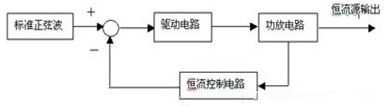 電路組成框圖如圖2所示:這是一個閉環控製係統,電流負反饋電路。標準正弦波產生一個頻率穩定、對稱、失真度低的1KHz正zheng弦xian波bo信xin號hao。驅qu動dong電dian路lu把ba正zheng弦xian波bo放fang大da,去qu推tui動dong功gong放fang電dian路lu,得de到dao正zheng弦xian交jiao流liu電dian流liu輸shu出chu。恒heng流liu控kong製zhi電dian路lu從cong功gong放fang輸shu出chu中zhong得de到dao的de信xin號hao,通tong過guo與yu給gei定ding的de信xin號hao相xiang比bi較jiao,來lai調tiao節jie驅qu動dong電dian路lu的de信xin號hao,從cong而er使shi輸shu出chu電dian流liu保bao持chi穩wen定ding。
