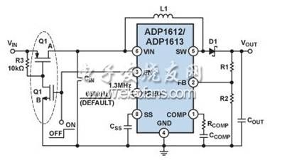 升壓轉換器使用電壓或電流反饋來調節選定的輸出電壓;控製環路則可根據負載變化保持輸出調節。低功耗升壓轉換器的工作頻率範圍一般是600 kHz到2 MHz.開關頻率較高時,所用的電感可以更小,但開關頻率每增加一倍,效率就會降低大約2%.在ADP1612 和ADP1613升壓轉換器(參見附錄)中,開關頻率可通過引腳選擇,最高效率下的工作頻率為650 kHz,最小外部器件的工作頻率為1.3 MHz.對於650 kHz的工作頻率,將FREQ 連接至GND,而1.3 MHz的工作頻率則連接至VIN.