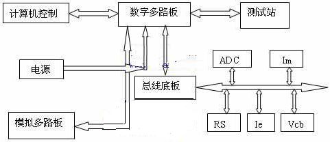 熱阻測試係統的基本構架是計算機通過軟件控製精密模擬和數字電路,實現對被測器件的條件施加→結果采樣→篩選→計算→比較→判別等一係列程序控製,完成對被測器件電參數的自動測試,每次測試的全過程小於0.2秒。係統主要有模擬多路板、數字多路板、ADC板、Im 板、Ie板和Vcb板組成,如圖1所示。