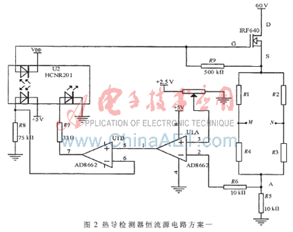 如圖2所示為恒流源的電路圖。輸出信號為M、N,即通過測量M、N兩點間的電位差,就能測出物質的成分和含量。圖2中R5是采樣電阻,阻值10 Ω,當電流為上限250 mA時,采樣電壓為2.5 V,采樣電壓輸入到AD8662的2腳,AD8662的3腳接電位器RW,RW的一端接地,另一端接+2.5 V電壓基準,此+2.5 V是通過穩壓芯片ADR431輸出,溫度穩定1 ppm/℃。設定好電位器的電壓後,當AD8662的2腳、3腳電壓不相等時,其差壓經運放AD8662開環放大(開環放大倍數2.2×105)驅動AD8662的5腳,U1B和線性光耦HCNR201構成光耦隔離的放大電路,放大比為500 K/75 K=6.7倍。AD8662和HCNR201構成放大比1.47×106的差壓放大電路,並且起到穩流作用。當橋流有0.1 μA的波動時,施加到IRF640柵極的電壓變化達1.47 V,使IRF640增加或減小電流,從而消除電流波動。