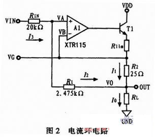 1)XTR115屬於二線製電流變送器,內部的2.5 V基準電壓可作為傳感器的激勵源。XTR115可將傳感器產生的40~200μA弱電流信號放大100倍,獲得4~20 mA的標準輸出。當環路電流接近32 mA時能自動限流。如果在3腳與5腳之間並聯一隻電阻,就可以改變限流值。