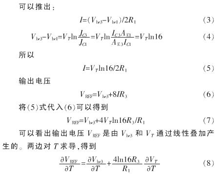 本文提出的電路核心結構如圖1所示,在電路中雙極晶體管構成了電路的核心,實現了VBE與VT的線性疊加,獲得近似為零溫度係數的輸出電壓。圖1中雙極型晶體管Q1和Q2的發射區麵積相同,Q3和Q4的發射區麵積相同,考慮設計需求,取Q1和Q2的發射區麵積為Q3和Q4的發射區麵積的8倍。