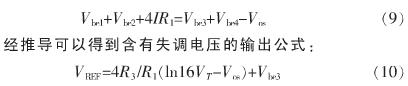 基ji準zhun源yuan中zhong運yun放fang的de設she計ji是shi非fei常chang重zhong要yao的de,運yun放fang的de失shi調tiao是shi基ji準zhun源yuan的de一yi個ge主zhu要yao誤wu差cha源yuan。由you於yu不bu對dui稱cheng性xing,運yun放fang會hui受shou到dao輸shu入ru失shi調tiao的de影ying響xiang。假jia設she失shi調tiao電dian壓ya為weiVos,經計算得到含失調電壓的輸出公式為: