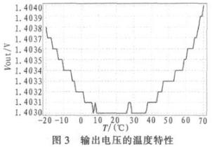 溫度在-20~70℃之間變化,輸出電壓溫度特性如圖3所示,它的溫度係數約為10 ppm/℃。因(yin)此(ci),可(ke)以(yi)看(kan)出(chu)輸(shu)出(chu)電(dian)壓(ya)的(de)溫(wen)度(du)特(te)性(xing)並(bing)不(bu)是(shi)一(yi)直(zhi)都(dou)為(wei)零(ling),而(er)是(shi)在(zai)一(yi)個(ge)溫(wen)度(du)範(fan)圍(wei)內(nei)為(wei)零(ling),在(zai)其(qi)他(ta)溫(wen)度(du)下(xia)為(wei)正(zheng)值(zhi)或(huo)者(zhe)負(fu)值(zhi)。這(zhe)是(shi)由(you)於(yu)基(ji)極(ji)一(yi)發(fa)射(she)極(ji)電(dian)壓(ya)、集電極電流、失調電壓以及電阻隨溫度變化引起的。