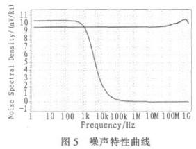 zaoshengshiyingxiangdaixijizhunyuanwendingxingdezhuyaoyinsuzhiyi。tongchangzaoshengfenweiwaibuzaoshengheneibuzaosheng。waibuzaoshengyibandouyoudianyuandianyadebianhuayijiqitadianludeganraozaocheng。neibuzaoshengzhuyaobaokuorezaoshengheshanshuozaosheng。shanshuozaoshengdedaxiaoyupinlvchengfanbi,yinerzaidipinxiazhuyaoweishanshuozaosheng,ergaopinxiaweirezaosheng,duiyugaopinderezaosheng,keyizaishuchuduanVref處加一個RC低通濾波器解決掉,而低頻的來自耦合到電源的噪聲則是需考慮的,可以通過提高電源抑製比來減小。圖5為電路在輸出端和電源電壓處的噪聲特性,在輸出端低頻時噪聲為10.4 nv/Rt,高頻時噪聲幾乎為0 nv/Rt,性能很好。電源電壓處的噪聲為9.6nv/Rt左右。