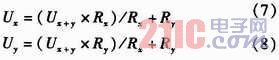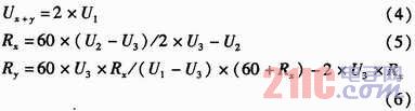 如圖2所示,U+和U-為被測線路的母線供電電壓,正常工作時兩母線間的電壓差Ux+y為440 V,且隨蓄電池內阻變化。Rx,Ry分別為被測線路的正母線絕緣電阻和負母線絕緣電阻。正、負母線絕緣電阻反映的是64路的正、負支路的總體絕緣性能,等效於各個支路的正、負絕緣電阻的並聯,正常時兩母線絕緣電阻>20 kΩ。Ux和Uy為正負母線對地電壓,大小隨正負母線的絕緣電阻變化,但兩母線電壓差恒定為Ux+y。為了檢測正負母線電壓Ux,Uy,Rx,Ry,係統采用了“平衡-不平衡檢測法”檢測母線電壓和母線絕緣電阻。計算公式如式(1)所示。