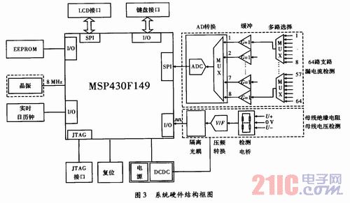 直流接地檢測係統采用低功耗處理器MSP430F149為硬件核心,外圍電路可分為數據采集模塊、人機交互模塊、處理器模塊。數據采集模塊負責檢測64路支路的漏電流、母線電壓、母線絕緣電阻;人機交互模塊負責進行液晶顯示和鍵盤輸入;處理器模塊負責協調整個係統的數據處理,數據存儲,人機交互等。具體的硬件結構框圖,如圖3所示。