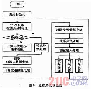 整個程序的編寫均由C語言完成,在程序設計中,采用了結構化程序設計方法,使各個模塊程序相對獨立,便於程序代碼的維護、移植和升級。同時,這樣分離式的程序設計,降低了代碼的調試難度,縮短了調試周期。將與接地故障信息(如母線電壓,母線絕緣電阻,支路絕緣電阻,接地支路號等)密切相關的數據放在一個結構體裏,便於掉電存儲與回放顯示。係統的主程序流程圖,如圖4所示。