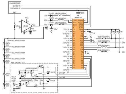 圖 1:6節電池監視係統的簡化原理圖。LTC6803 測量電池電壓並控製外部電池放電晶體管。LT1999 測量至電池組的充電和放電電流。