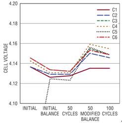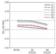 電池組 1 經過了 100 個充電 / 放電周期,圖 3 顯示若幹周期後記錄 6 jiedianchidedianya。gaituxianshi,jingguoduanzantingdunhou,zaiyigewanzhengdechongdianzhouqijieshushisuocedededianchidianya。chongdianhou,dianchidianyazhijiandebupinghengyurongliangheneibudianzudexiaoliangbianhuayouguan。zaidiyigewanzhengdezhouqizhong,cedededianchizurongliangwei 2.072AHr,經過 100 個周期後,所測得的容量為 2.043AHr,隨著周期數增加,容量有少量下降。還有一種趨勢,即隨著充電 / 放電周期數的增加,充電後電池的最終電壓下降了,100 gezhouqiyihou,zhezhongqushiyouqixianzhu。zhezhongqushizuiyoukenengshiyinweidianchilaohuayinqidianchineibudianzudexiaoliangzengjiadaozhide。neibudianzuzengjiashidianchigengkuaididadaochongdianjieshumenxian。jinguanzaigongzuoshimeiyoupingheng,zhegedianchizuzai 100 個周期中自始至終保持著同樣程度的不平衡。能像這個電池組一樣,每節電池自然而然相互匹配的電池組相當罕見。