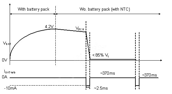 使用者亦有可能在充電或式充電完畢後,在未將電源移除的情況下,即抽離電池的情況。為避免造成危險,IC內部應具有如圖7, 8的電池存在偵測機製。充電IC會以短時間脈衝(每370ms產生2ms的脈衝)方式抽取電池電流,此時若電池存在,則偵測到的電池電壓應大於一預設閥值;若電池已切離,則充電IC偵測到一低電壓,即可判定為電池斷開狀態,並將電池端電壓切斷,保護使用者安全。