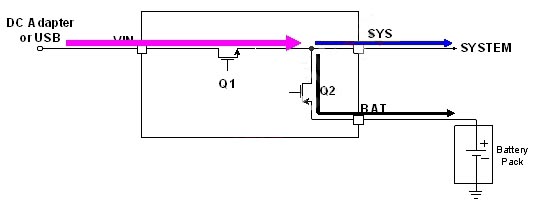 LD6275具有適應性電源路徑管理(Adaptable Power Path Management, APPM)功能,其為以供給係統端用電為主,對電池充電為輔,如圖3所示;當係統用電超過輸入電源的供給限製時,其電池亦能主動開啟放電功能同時對係統端供給其所需之電能需求,如圖4所示。