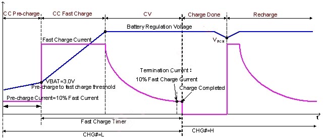 然而,當電池故障時,電池可能無法儲存電能,電壓抑不會升高,所充入的能量轉變成熱,除了依靠過溫度保護機製之外,IC內部亦具有超時計時器,無論此時電池電壓狀態如何,隻要超過設定充電時間後,隨即關閉充電器,以達到多重保護使用者之功能。