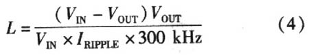 電感的關鍵參數是電感係數、峰值電流和直流阻抗。電感係數與電感波紋電流峰-峰值、輸入電壓以及輸出電壓有關(工作頻率是300kHz)。即: