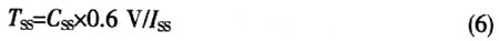 該器件無允許快速啟動的內部軟啟動,但是也會產生大的浪湧電流。因此,對於需要降低浪湧電流的應用,該器件有限製DC/DC轉換調節器啟動時浪湧電流的電路。浪湧電流限製電路可作為軟啟動。外部的SS引腳用來調節軟啟動的特殊應用。電流ISS影響外部軟啟動電容器CSS,軟啟動時間計算為: